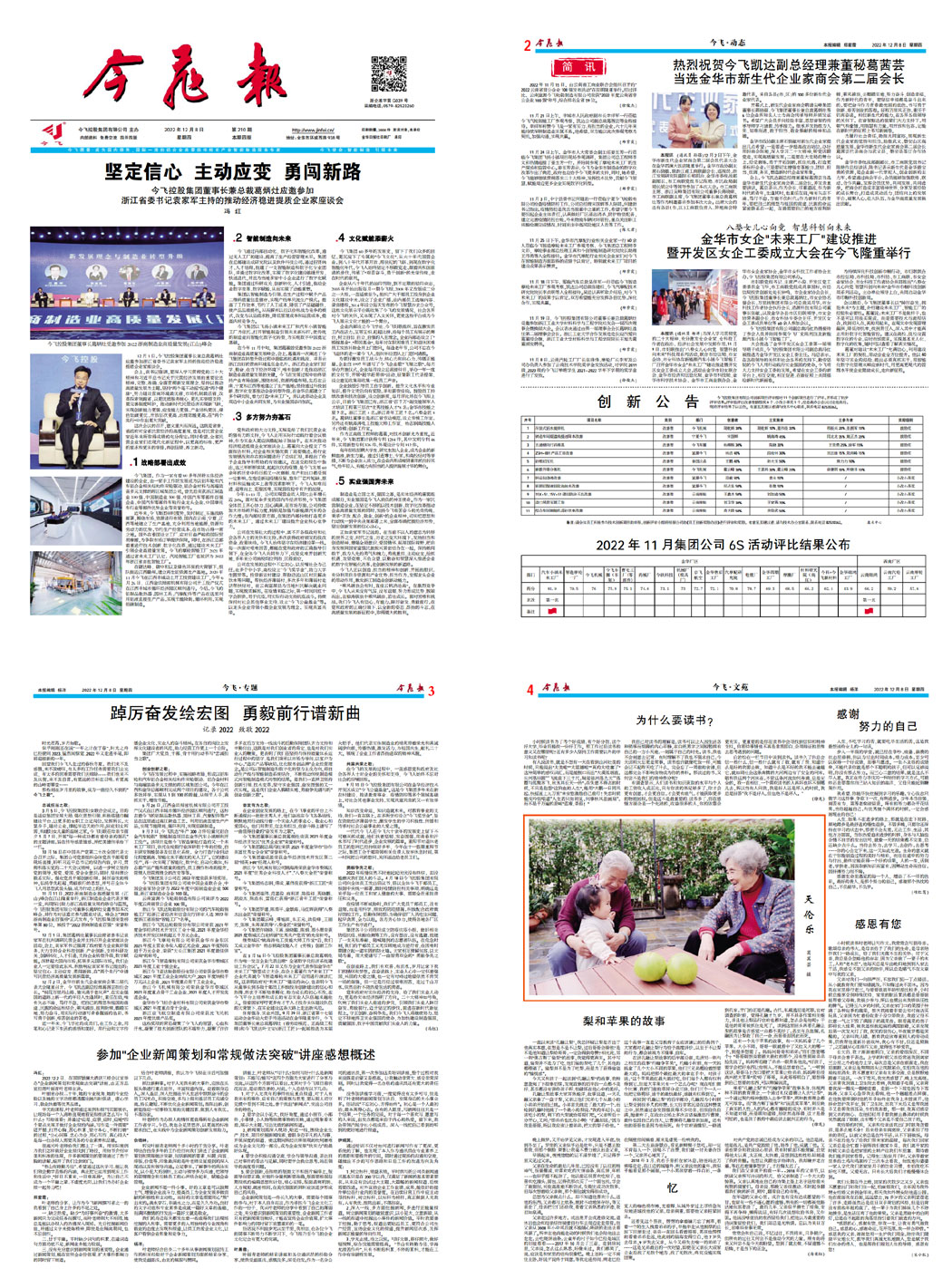 堅(jiān)定信心 主動(dòng)應(yīng)變 勇闖新路,今飛控股集團(tuán)董事長(zhǎng)兼總裁葛炳灶應(yīng)邀參加浙江省委書記袁家軍主持的推動(dòng)經(jīng)濟(jì)穩(wěn)進(jìn)提質(zhì)企業(yè)家座談會(huì)簡(jiǎn)訊熱烈祝賀今飛凱達(dá)副總經(jīng)理兼董秘葛茜蕓當(dāng)選金華市新生代企業(yè)家商會(huì)第二屆會(huì)長(zhǎng)八婺女兒心向黨 智慧科創(chuàng)向未來,金華市女企“未來工廠”建設(shè)推進(jìn)暨開發(fā)區(qū)女企工委成立大會(huì)在今飛隆重舉行創(chuàng)新公告2022年11月份集團(tuán)公司6S活動(dòng)評(píng)比結(jié)果公布踔厲奮發(fā)繪宏圖 勇毅前行譜新曲參加”企業(yè)新聞策劃和常規(guī)做法突破”講座感想概述為什么要讀書?感謝, 努力的自己感恩有您梨和蘋果的故事