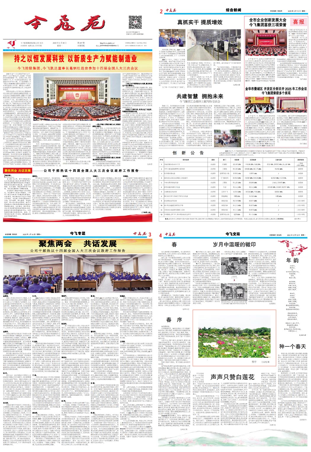 持之以恒發(fā)展科技,以新質(zhì)生產(chǎn)力賦能制造業(yè)——今飛控股集團(tuán)董事長、今飛凱達(dá)董事長葛炳灶赴京參加十四屆全國人大三次會議聚焦兩會 共話發(fā)展——公司干部熱議十四屆全國人大三次會議政府工作報告聚焦兩會 共話發(fā)展——公司干部熱議十四屆全國人大三次會議政府工作報告真抓實干 提質(zhì)增效共建智慧 擁抱未來 | 今飛集團(tuán)工會組織主題寫作交流會喜報|全市企業(yè)創(chuàng)新發(fā)展大會隆重舉行,今飛集團(tuán)喜獲三項榮譽(yù)喜報|金華市婺城區(qū)、金華市開發(fā)區(qū)分別召開2025年工作會議,今飛集團(tuán)榮獲多個獎項創(chuàng) 新 公 告歲月中溫暖的轍印春 序年 韻種一個春天聲聲只贊白蓮花