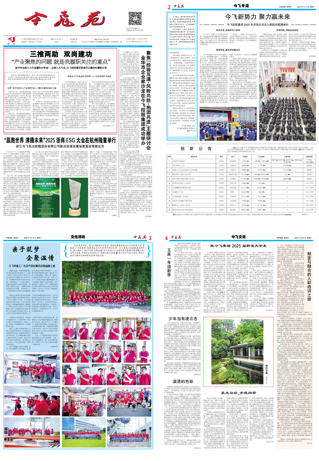 三推兩助 雙崗建功——產(chǎn)業(yè)聚焦的問題 就是我履職關注的重點(金華市各級人大代表履職分享會--全國人大代表、今飛控股集團黨委書記葛炳灶履職分享)金華市企業(yè)家沙龍在今飛控股集團成功舉辦——聚焦“經(jīng)驗互通?風險共防?抱團共進”主題研討會“贏跑世界 沸騰未來”2025浙商ESG大會在杭州隆重舉行,浙江今飛凱達輪轂股份有限公司副總經(jīng)理兼董秘葛茜蕓受邀出席熱烈歡迎新同事入職今飛新勢力 聚力贏未來——今飛控股集團2025年應屆大學生入職培訓圓滿舉行創(chuàng) 新 公 告“親子筑夢 企聚溫情”——今飛異地工廠先進代表回集團總部溫暖之旅晨光初啟,步履向前滾燙的色彩又是一年迎新季致今飛集團2025屆新進大學生少年當有凌云志蛻變與融合的入職培訓之旅